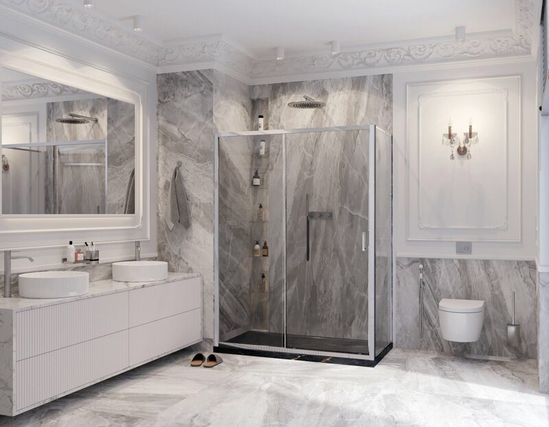 Раздвижные двери — это универсальная конструкция, занимающая минимум места в душевой кабине. Они удобны и функциональны, а также они предотвращают попадание воды за пределы пространства для мытья. Такая форма дверей может успешно герметизировать бокс, так что ни одна капля не окажется на полу. К тому же данная конфигурация не требует много места, что позволяет сэкономить пространство в ванной. Раздвижные двери не помешают уборке, ведь они не загораживают доступ к стенам и пространству душевой — в этом их неоспоримое преимуество.