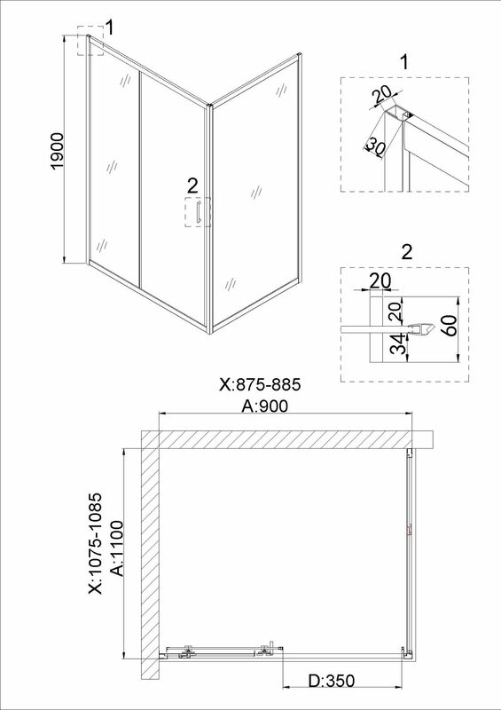 Душевое ограждение Niagara NG-42-9AG-A110G (90*110*190) прямоугольник, дверь раздвижная, 2 места