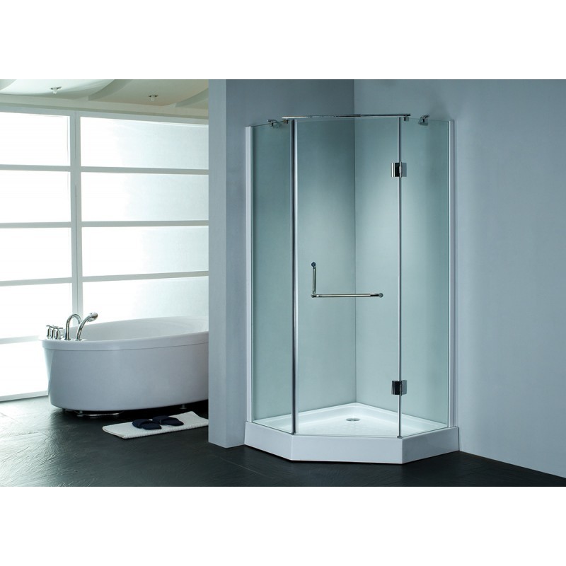 Форма поддона – многогранная, предназначенная для угловой установки. Конструкция используется при необходимости правильной организации пространства, использования площади небольшого санузла или в ванным с нестандартной, сложной конфигурацией. Визуально такой поддон кажется большим, но на самом деле он занимает не так много места. Особая многогранная форма отличается хорошей эргономикой, принимать душ будет удобно даже людям с крупной комплекцией. Минимальная длина поддона может составлять 80 см, максимальная – 120 см и даже больше, выбор зависит от площади ванной комнаты.