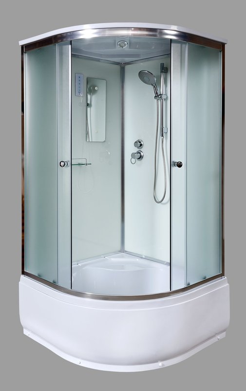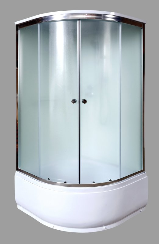 Оснащение • БЕЗСИЛИКОНОВАЯ СБОРКА • РЕЗЬБОВЫЕ СОЕДИНЕНИЯ • ДВОЙНЫЕ РОЛИКИ • усиленный акриловый поддон • антискользящее покрытие • белые закаленные задние стекла толщиной 4 мм • передние стекла 4 мм, матовые • зеркало • полочка • крепление (крючок) для мочалки • шт