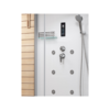 Кроме смесителя с переключателями и форсунок в кабине есть еще и блок управления. Он расположен на задней стенке душевой кабины и имеет вид области (прямоугольной, квадратной, овальной и т.д.) с кнопками или чувствительной сенсорной поверхностью. Может быть оснащен дисплеем. Иногда эту панель называют и пультом. Устройство позволяет: