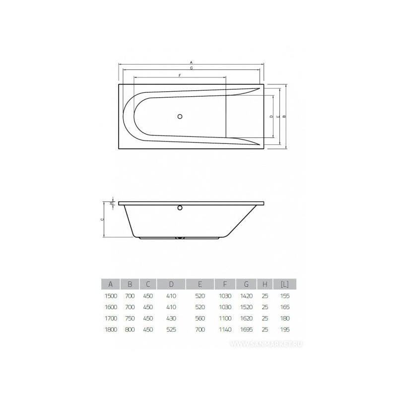 Прямоугольная акриловая ванна Vayer Boomerang 1500x700x450